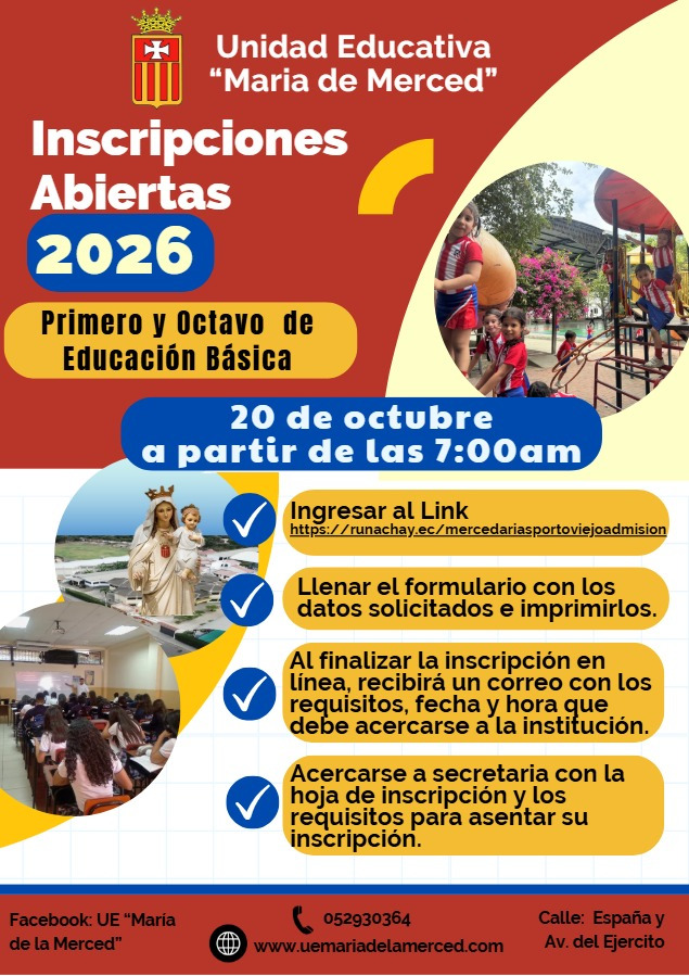 La Unidad Educativa María de la Merced oferta a partir de los 5 años de edad, que comprende de Primero a Décimo Año, garantizando el proceso de acompañamiento al desarrollo integral, considerando los aspectos afectivos, cognitivos, psicomotriz, social, de identidad, autonomía e inclusión, con orientaciones metodológicas de evaluación cualitativas. Buscando desarrollar habilidades, desprezas y competencia en niños, niñas y adolescentes.